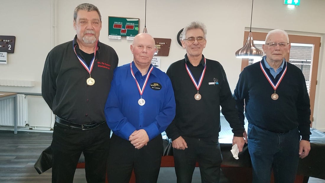 Finale in Nieuw Weerdinge, driebanden 3e klas 1. Andries van der Veen, 2. Jack Hamming, 3. Pieter van der Poel, 4. Be Boschma.
